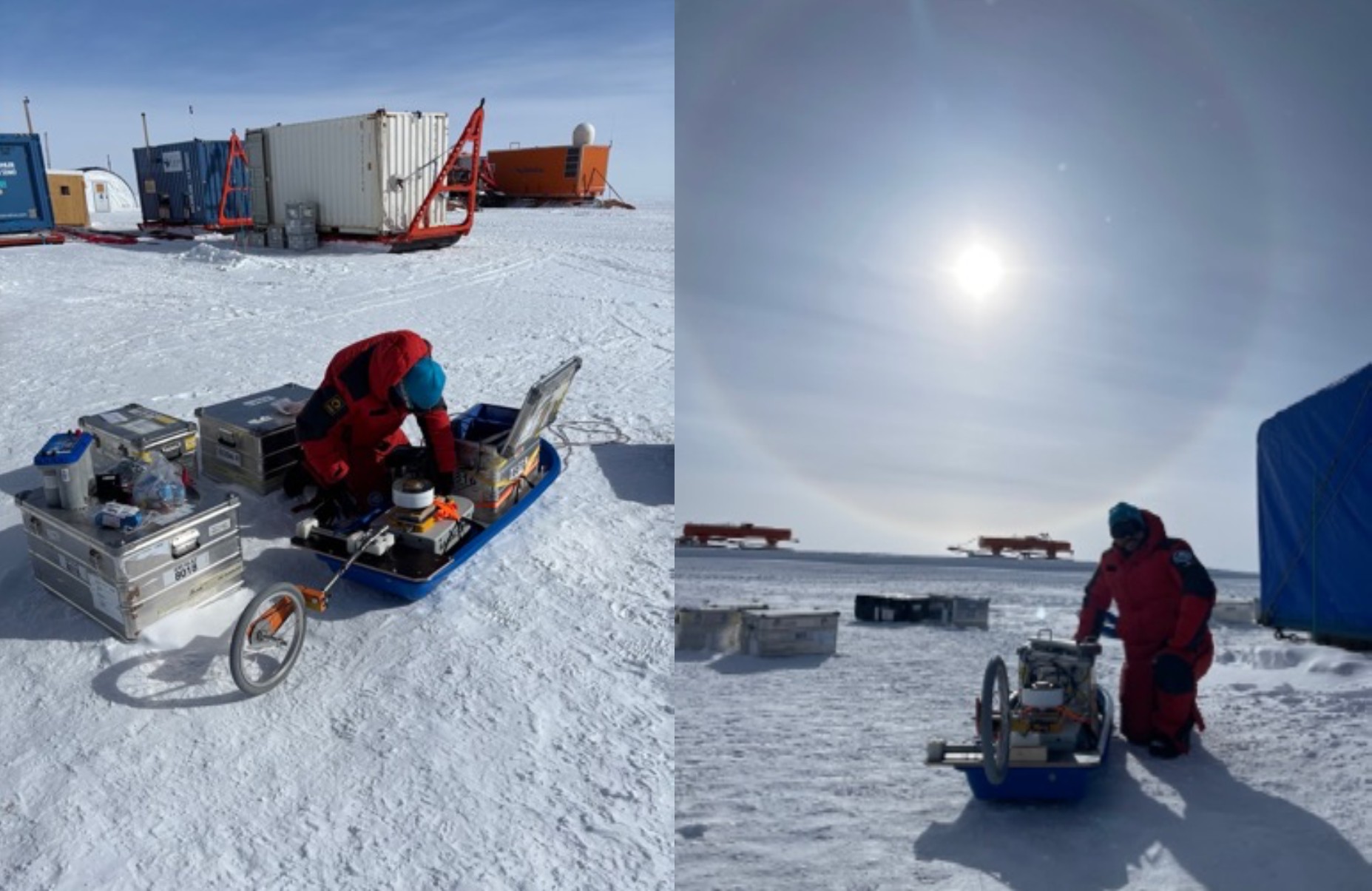 Henrique assembling the radar on a blue sledge. Photos by I. Koldtoft and B. Seth.