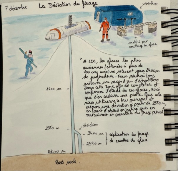 The deviation of the drilling in a nutshell, as perfectly illustrated by Marion, our nurse. We all try to keep Marion as inactive as possible concerning medical issues, and she returns the favor with beautiful watercolors about camp life, drawn in her now famous spiral notebook. Illustration M. Lahuec