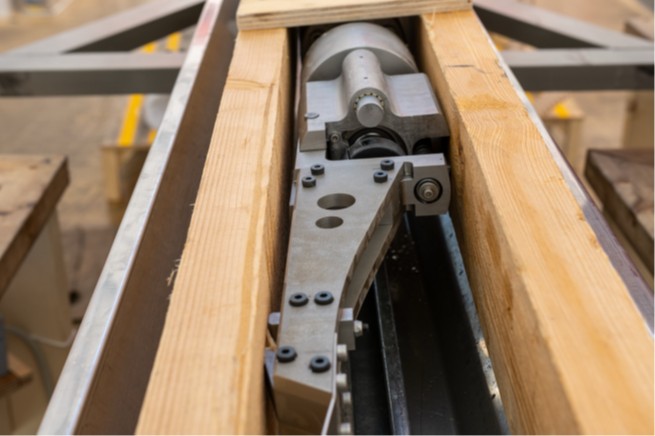 Testing the deviation tool with the wooden construction that should represent our hole. Here, it is obvious that the spring on the deviation tool was much too tense.. Photo by B. Seth.