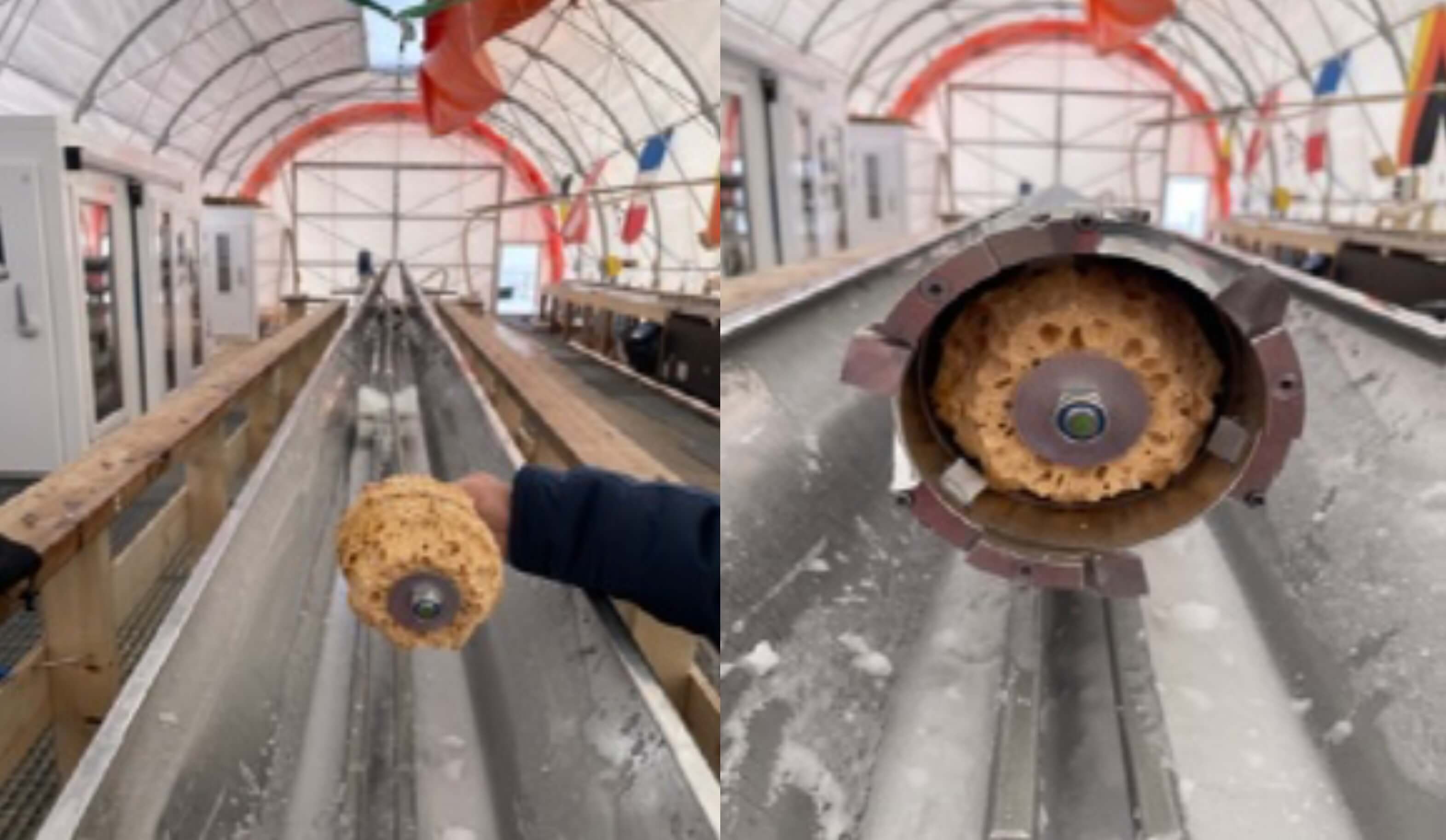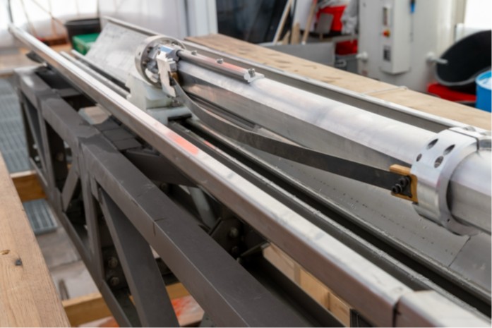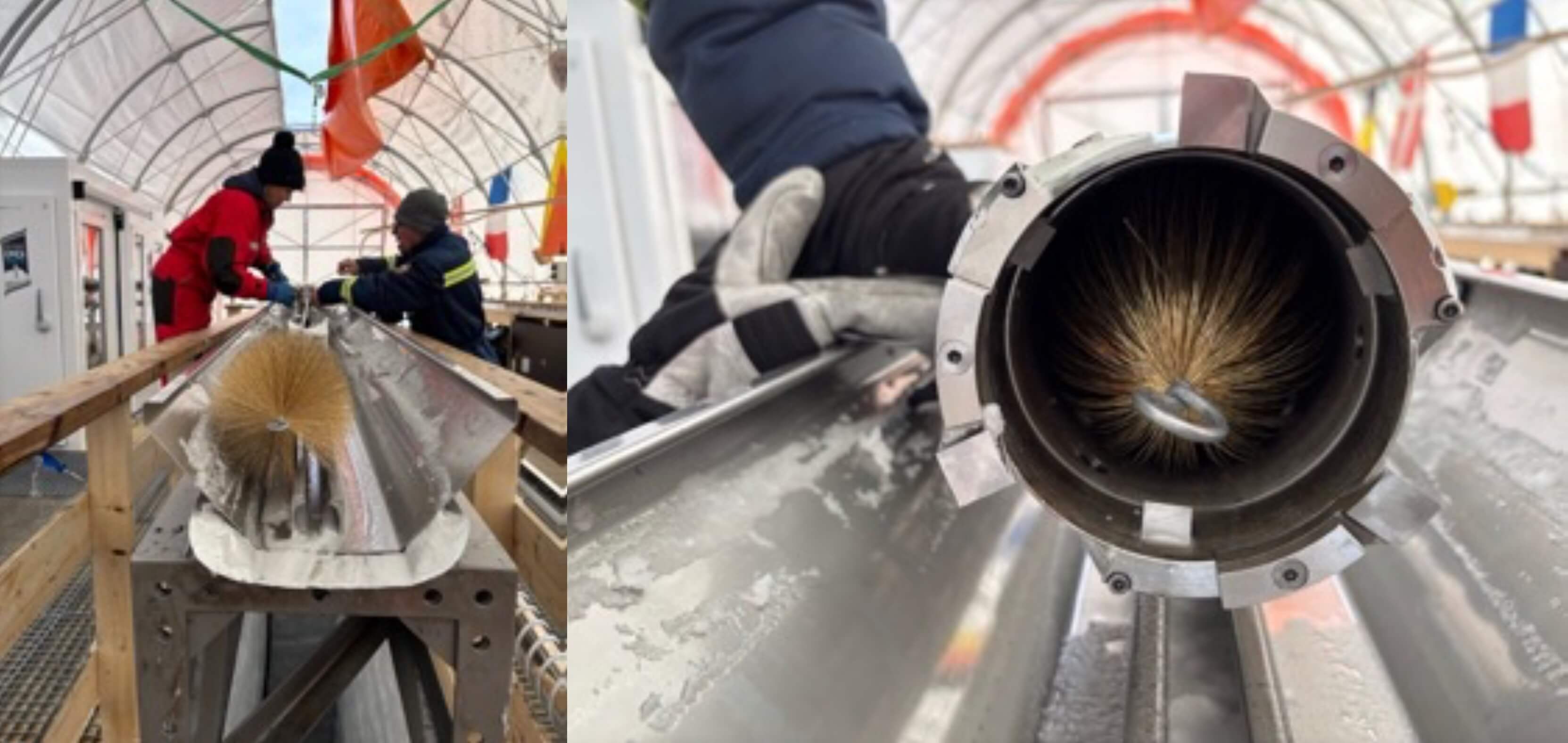 The shield protection of the drill core, “The sausage”, laying on the logging bench, and in use when the drill core pops up at the surface. The full operation implies the synchronization of about three person maneuvering a set of four cords like professional puppeteers. Photo, C. Barbante, G. Bianchi Fasani