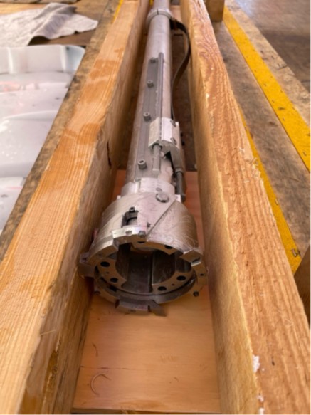 The rock core drill barrel at the surface. It is covered by the shield protection and ready to be transported to the Science Trench. Photo, G. Lawer