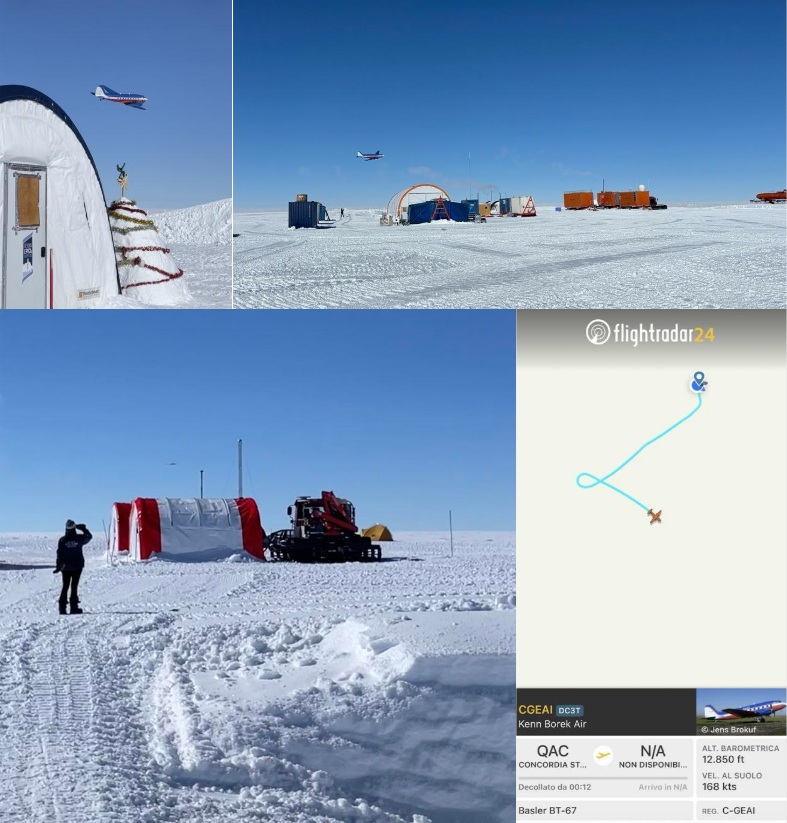 Tarmac at Dome C. Two Basler aircrafts (DC-3) bringing personnel and cargo. The Skidoo crew is ready to unload the cargo.
