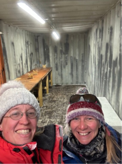 Iben and Marion after cleaning the red light container at -35 °C. Photo by I. Koldtoft