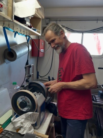 Gunther sharpening the outer edges of the cutters on the drill head. Pictures: B. Seth Photo by B. Seth.