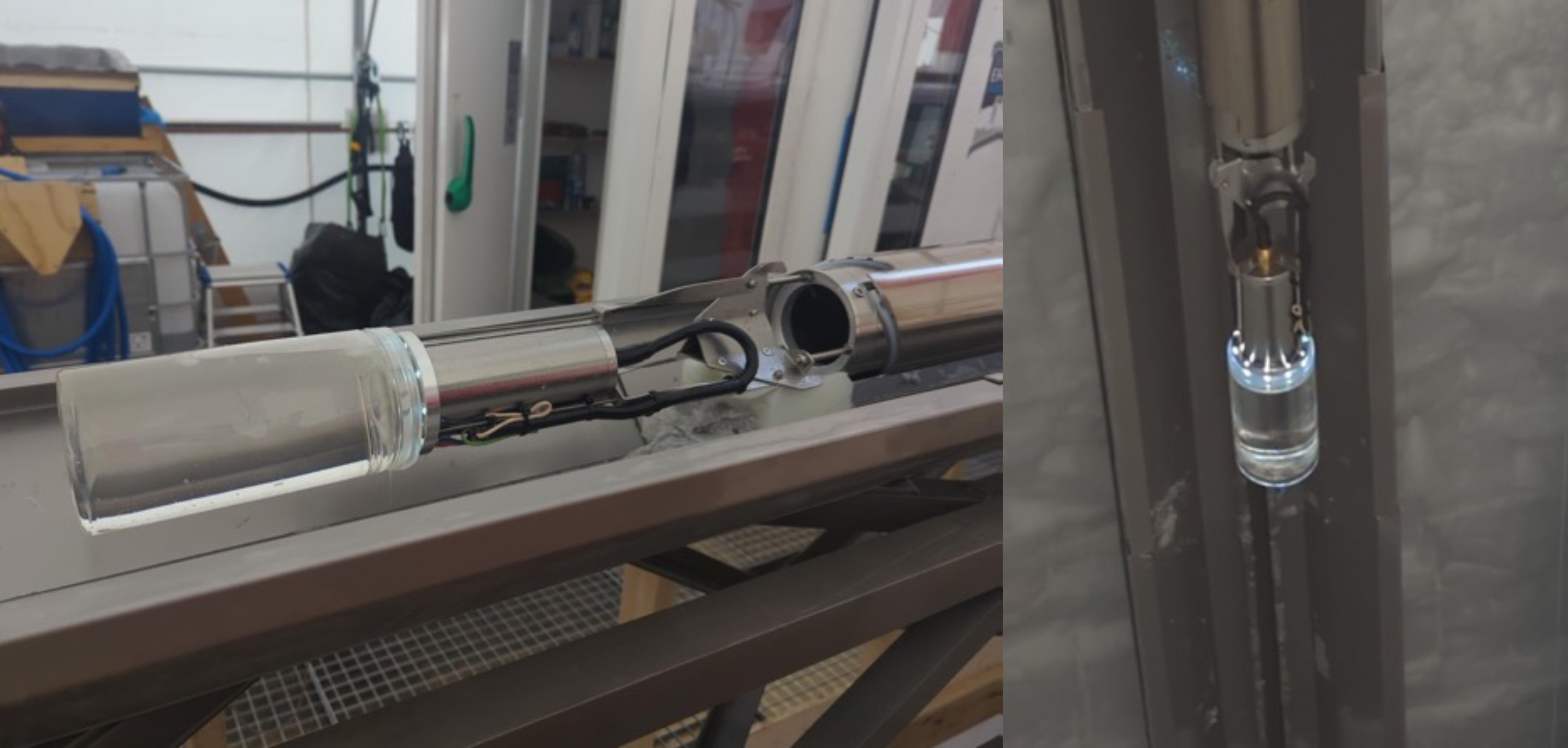 The camera mounted on the bottom of the drill barrel with the LED light ready to illuminate the deep part of the borehole. Photo C. Barbante